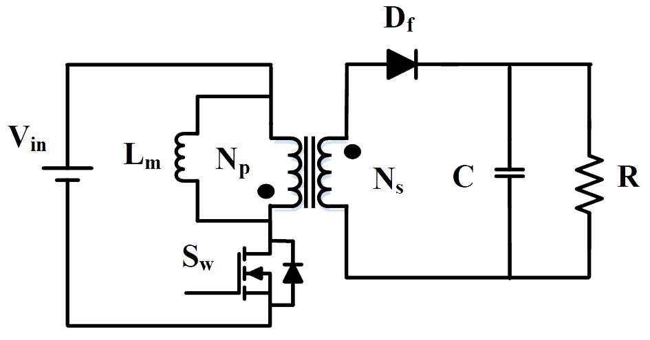 5. A flyback converter in continuous conduction mode converts 160 V DC to 3.3 V DC. If the duty cycle is 0.40, calculate the turns ratio of the transformer. Assume negligible voltage drop across switch and diode.